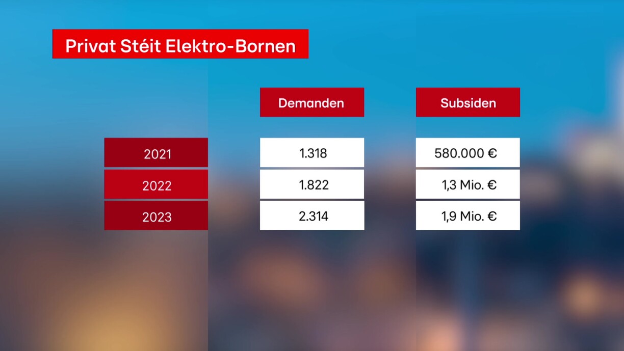Nieft dem ëffentleche Reseau, hu jo och vill Privat Stéit eng Borne doheem. D’Zuel vun den Demandë fir e Subsiden ze kréien ass zënter 2021 ëmmer weider an d’Luucht gaang. 2023 hunn 2314 Menagen eng Ufro, dat sinn 1,9 Milliounen Euro u Subsiden. Jee no Borne a Gebai belafen sech d’Bäihëllefen op 450 bis 1650 Euro.