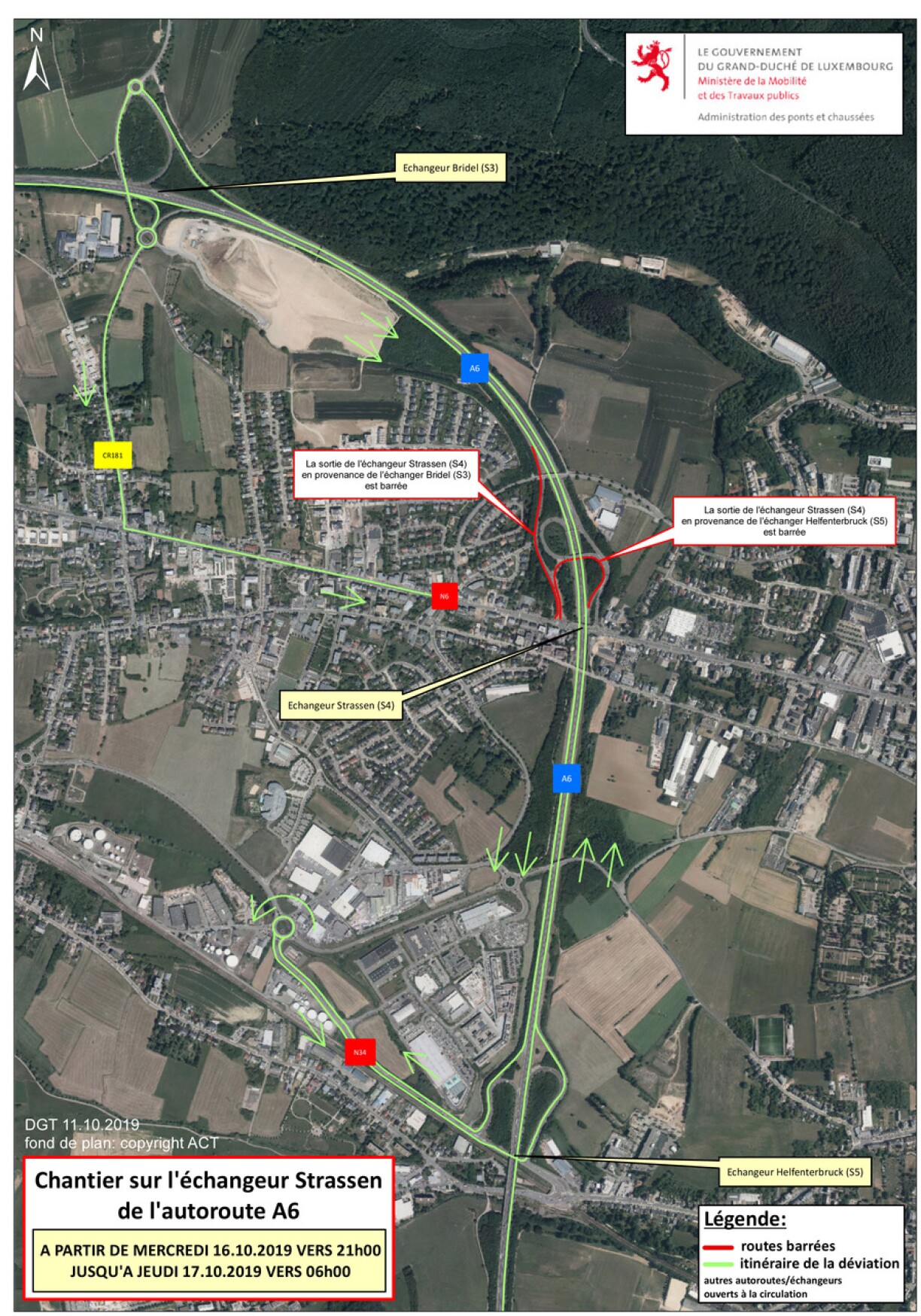 Communiqué par: Administration des ponts et chausséesL’Administration des ponts et chaussées procédera à la fermeture de la bretelle de sortie de l’A6 de l’échangeur Strassen (S4) en provenance de l’échangeur Bridel (S3) et de la bretelle de sortie de l’A6 de l’échangeur Strassen (S4) en provenance de l’échangeur Helfenterbruck (S5) dans le cadre des travaux de l’aménagement de l’échangeur A6/N6 et de la réhabilitation des ouvrages O.A. 1007 et O.A. 1036 du mercredi 16 octobre 2019 vers 21 heures jusqu’au jeudi 17 octobre 2019 vers 6 heures.