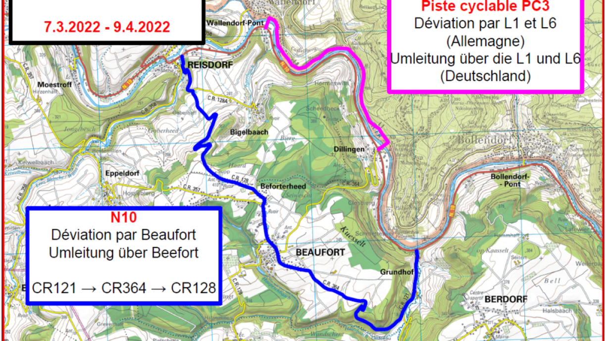En raison de travaux de sécurisation de la route nationale N10 qui seront effectués en collaboration avec l’Administration de la nature et des forêts, la route nationale N10 sera barrée du lundi 7 mars 2022 au samedi 9 avril 2022. La déviation passera par Grundhof-Befort-Reisdorf. La piste cyclable PC3 sera également barrée. La déviation passera par Wallendorf. |