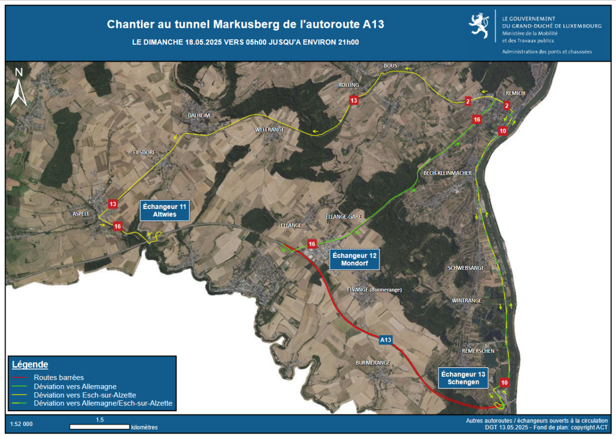 De Verkéier a Richtung Esch-Uelzecht gëtt iwwerdeem vum Echangeur Schengen un iwwer d’N10, d’N2, d’N13, d’N16 an den Echangeur Altwis deviéiert.