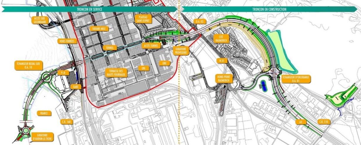 De Ralph Di Marco vun de Ponts et Chaussées erkläert d’Léisung, déi Entlaaschtung soll bréngen. Vun der Autobunn erof, iwwer eng Bréck iwwert engem neie Contournement bei Éilereng, ronn annerhallwe Kilometer laanscht den Quartier Raemerech, duerno iwwert d’N31 a Richtung Suessem, direkt an den Tunnel eran. D’Aarbechten hu schonn ugefaangen.