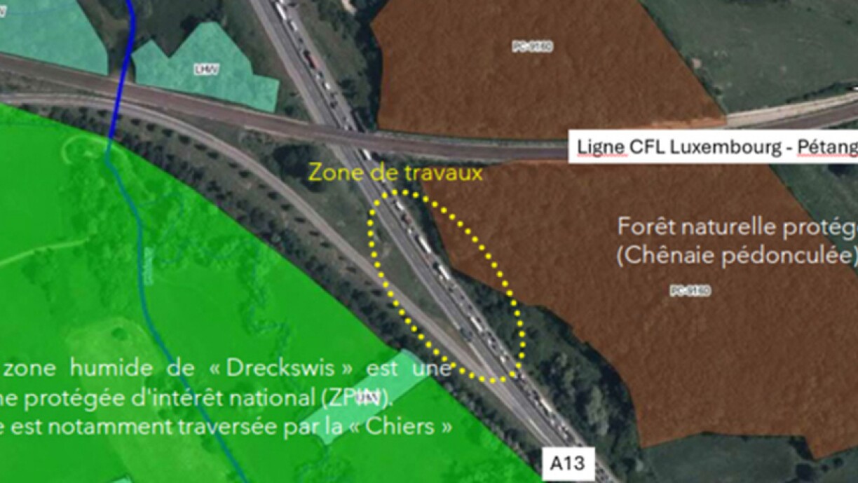 Grond dofir ass e Chantier tëscht der “Dreckswis” am Weste vun der Autobunn an dem Bobësch am Oste vun der A13. Hei gëtt eng Wëldbréck gebaut.