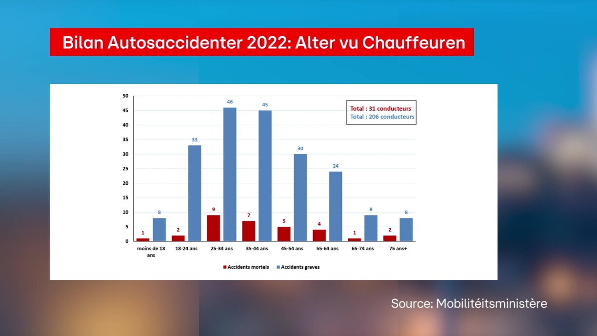Zuele vun 2022 weisen, datt schwéier an déidlech Verkéiersaccidenter virop vu Leit am Alter tëscht 25 a 44 Joer verursaacht ginn. Éischter seele vu Chauffeuren iwwer 65 Joer. Éischt Ursaach vu schwéieren Accidenter si Vitess an Alkohol.