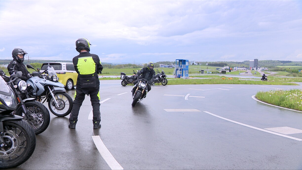 Slalom bei niddereger Vitesse, Bremsen, Parcoursen, ... déi verschiddenst Übunge stinn um Programm. “Mir maachen eng Remise en Form vun de Motarde fir déi nei Saison, fir déi Gesten, déi iwwert de Wanter vläicht vergiess gi sinn, oder net méi sou geüübt sinn, fir déi rëm ze üben an op déi essentiel Sécherheetsmoossnamen hinzeweisen”, erkläert den Eric Mathias, Direkter vum Centre de Formation pour Conducteurs.