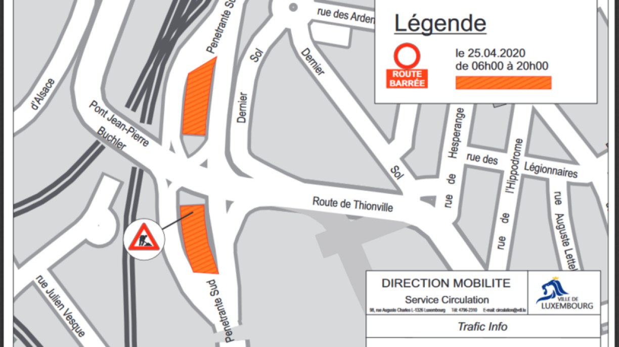 La Ville de Luxembourg et l’Administration des ponts et chaussées tiennent à informer les citoyens et les usagers de la route que des travaux de bétonnage d’une partie de la dalle du pont Buchler au-dessus de la Pénétrante Sud seront réalisés le samedi 25 avril 2020 de 06h00 jusqu’à 20h00.