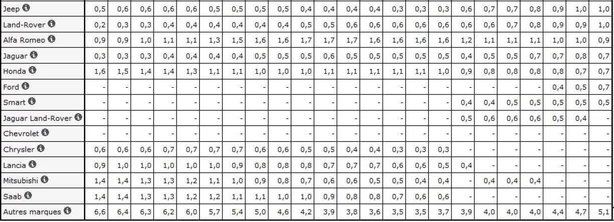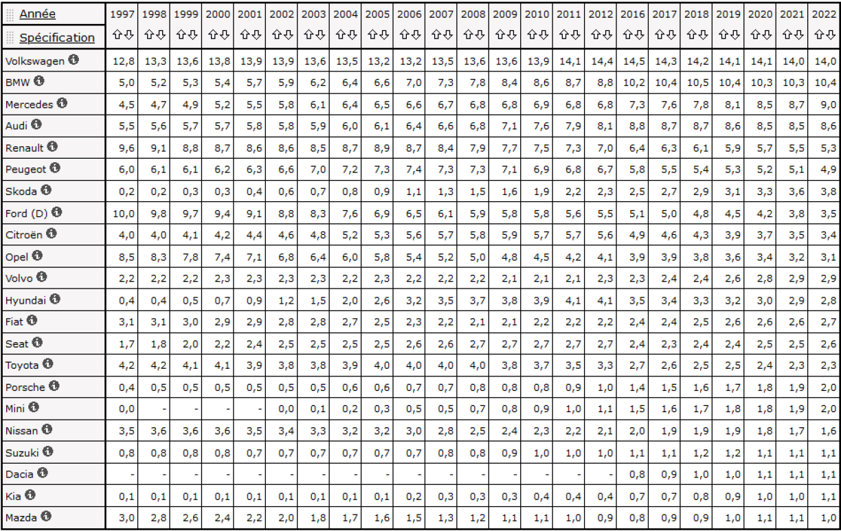 Däitsch Marke bleiwen dominant: VW (14%), BMW (10.4%), Mercedes (9%) an Audi (8,6%) zesummegeholl, maachen 42% vun allen Immatrikulatiounen aus. Op Plaz 5 kënnt Renault mat 5,3% als éischten net-däitsch Autosmark.