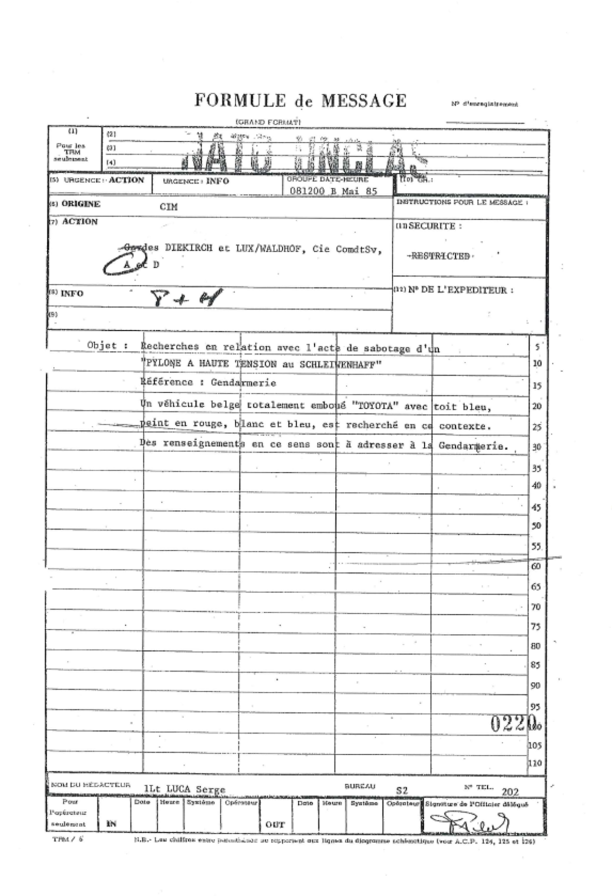 Et ass bei der Arméi prezis Buch geféiert ginn iwwer alles, wat am Manöver a soss am Land geschitt ass. D’ Militär huet de 7. Mee notéiert, um 23 Auer 06 wieren um Schléiwenhaff duerch eng Explosioun 2 Pylonen endommagéiert ginn, renseignement reçu par la gendarmerie. Den Dag nom Attentat schreift e Leutnant an engem anere Manöver-Journal en interessant Schrëftstéck. Et ass eng sougenannt Formule de message.