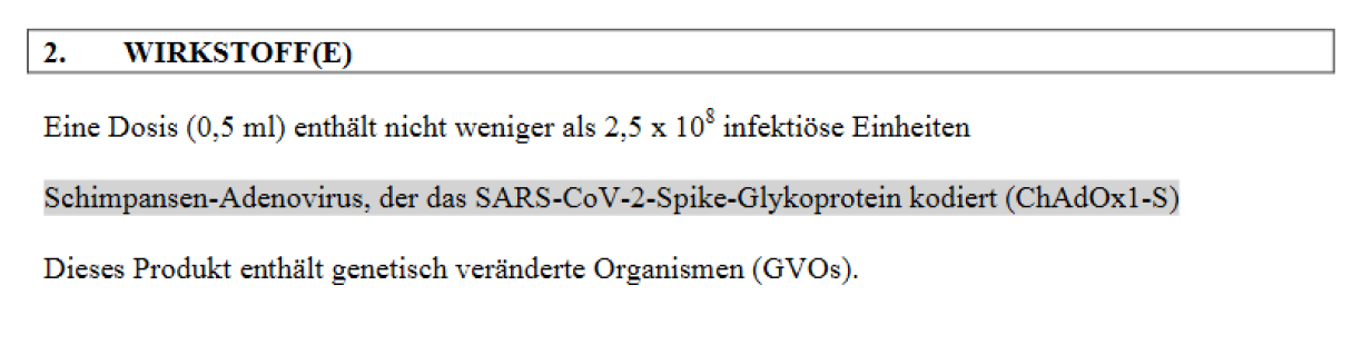 Dësen Adenovirus ass en Erkältungsvirus, dee genetesch verännert gouf, fir am mënschleche Kierper Schutz géint de Coronavirus opzebauen. Den Adenovirus gëtt hei als Vecteur benotzt. Dat heescht, déi eigentlech Informatiounen vum Coronavirus sinn hei am Adenovirus verpaakt. Dobäi ginn déi mënschlech Zellen duerch d’Impfung an den Asaz vun de Schimpansen-Adenoviren net genetesch verännert an no enger Zäit ofgebaut.