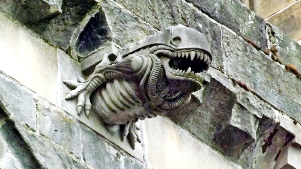 An esou koum et, datt op enger Kathedral a Schottland eng Figur hänkt, déi där vun engem Xenomorph aus den Alien-Filmer staark änelt. Si ass awer net just eng Referenz op d’Pop-Culture, mä erfëllt och ganz normal hiren Zweck: Si späizt Waasser, wann et sech ze vill um Daach vun der Kathedral gesammelt huet.