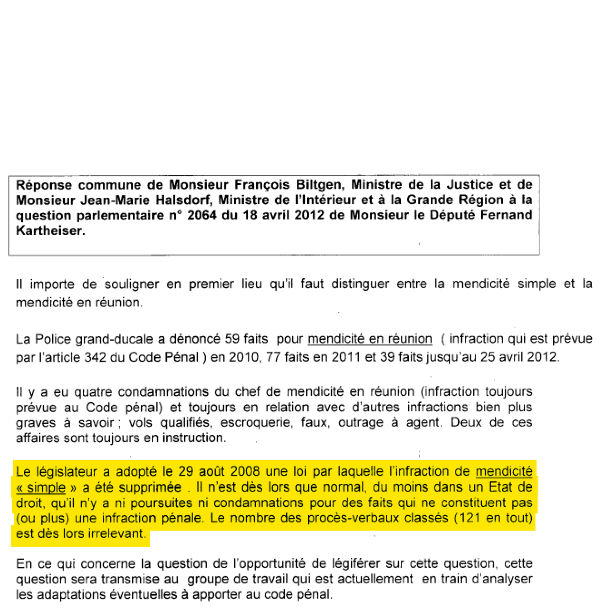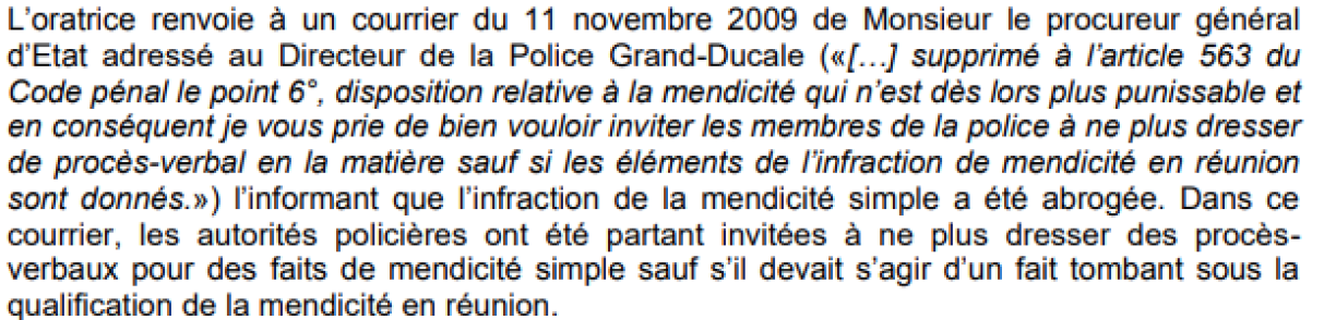 Ma méi spéit an der nämmlechter Reunioun sot hien, se wier duerch d’Gesetz vun 2008 ofgeschaaft an d’Geriichter géifen dat esou applizéieren: “Les organes relevant du pouvoir judiciaire, pouvoir indépendant, appliquent le texte de loi dans la teneur telle qu’il a été publié au Mémorial, Journal Officiel. En d’autres termes, le fait de la mendicité simple a été abrogé.”