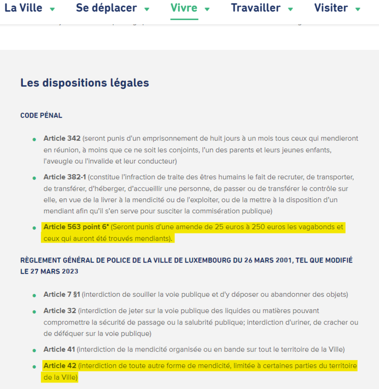 De Stater Schäfferot an den Inneminister Léon Gloden soen, dat neit Policereglement vun der Stad Lëtzebuerg wier drop ausgeriicht, fir géint déi “aggressiv” oder “organiséiert” Heescherei virzegoen. Déi war awer scho virdru am Stater Policereglement verbueden. An am Artikel 42 heescht et dowéinst elo: “toute autre forme de mendicité est également interdite (…).” Dobäi berifft sech d’Stad Lëtzebuerg op hirem Site explizitt op den Artikel 563 Punkt 6 - mä léisst awer dobäi d’Foussnott op der Säit, déi erkläert, e wier ofgeschaaft.