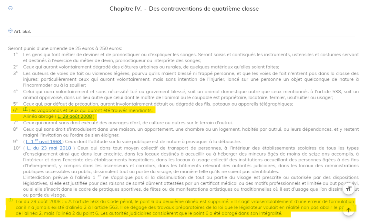 An der Foussnott, déi also zum éischten Abschnitt vum Punkt 6 gehéiert, steet, et wier duerch e Feeler 2008 ofgeschaaft ginn a géif dohier net vun de Geriichter applizéiert: “Loi du 29 août 2008: ‘A l’article 563 du Code pénal, le point 6 du deuxième alinéa est supprimé.’ Il s’agit vraisemblablement d’une erreur de formulation car il n’a jamais existé d’alinéa 2 à l’article 563. Il se dégage des travaux préparatoires de la loi que le législateur voulait en réalité non pas abolir le point 6 de l’alinéa 2, mais l’alinéa 2 du point 6. Les autorités judiciaires considèrent que le point 6 a été abrogé dans son intégralité.”