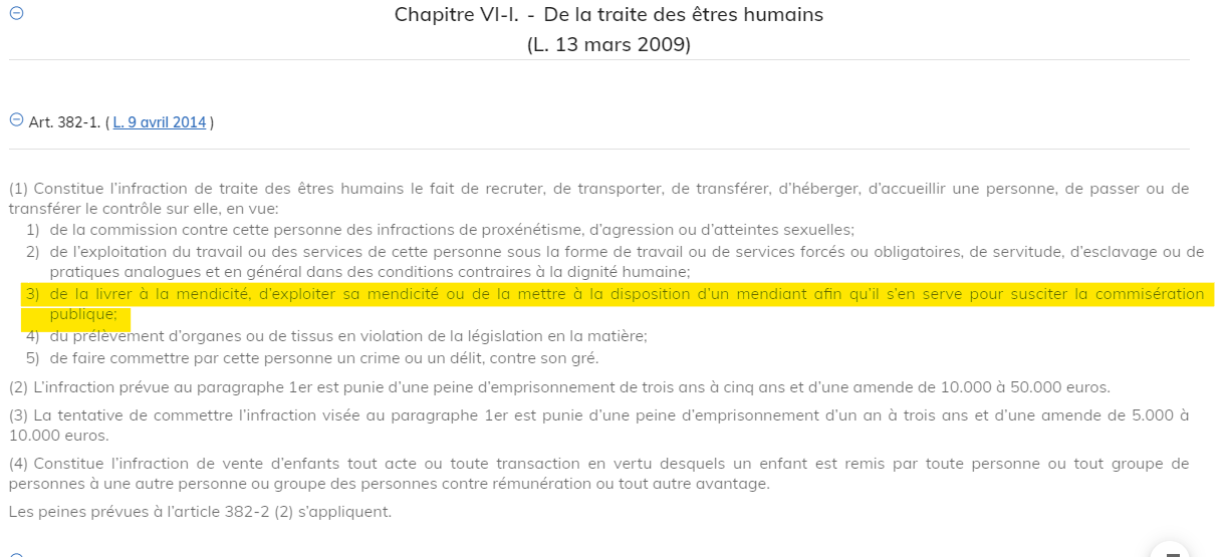 An den Artikel 382-1 verbitt och de Mënschenhandel am Zesummenhang mat Heescherei, also ënnert anerem, Leit ze rekrutéieren oder ze transportéieren, fir se heeschen ze loossen.