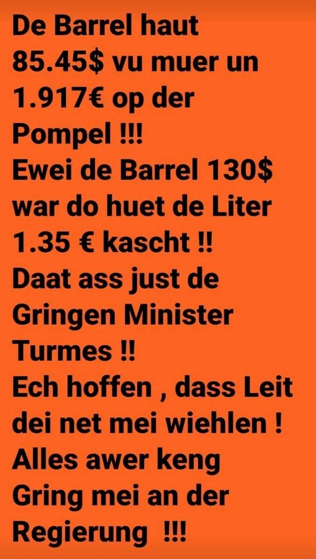 Op Nofro kann den Energieministère de Verglach, deen den Auteur vum Post mécht, net novollzéien, well dem Ministère keng Situatioun bekannt ass, wou de Barrel 130 Dollar an den Endproduit 1,35 Euro gewiescht wier. D’Donnéeë géife kloer weisen, dass et eng Korrelatioun tëscht dem Barrelpräis an dem Endproduit gëtt.