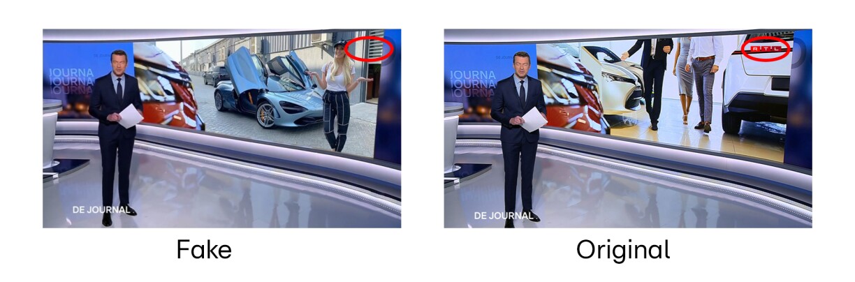 Wann ee béid Biller matenee vergläicht, kann een erkennen, datt beim Verschaffe verschidde Saachen ewechgelooss goufen. Wéi et normal bei enger Noriichtechaîne ass, ass am original uewe riets de Logo vun RTL Lëtzebuerg ze gesinn an ënne lénks d’Ablent vum Journal. Wärend d’Journal-Zeeche bei der Fälschung bliwwen ass, ass den RTL-Logo selwer verschwonnen, well do dat anert Bild, wat besser bei den neien Narrativ passt, driwwer geluecht gouf.