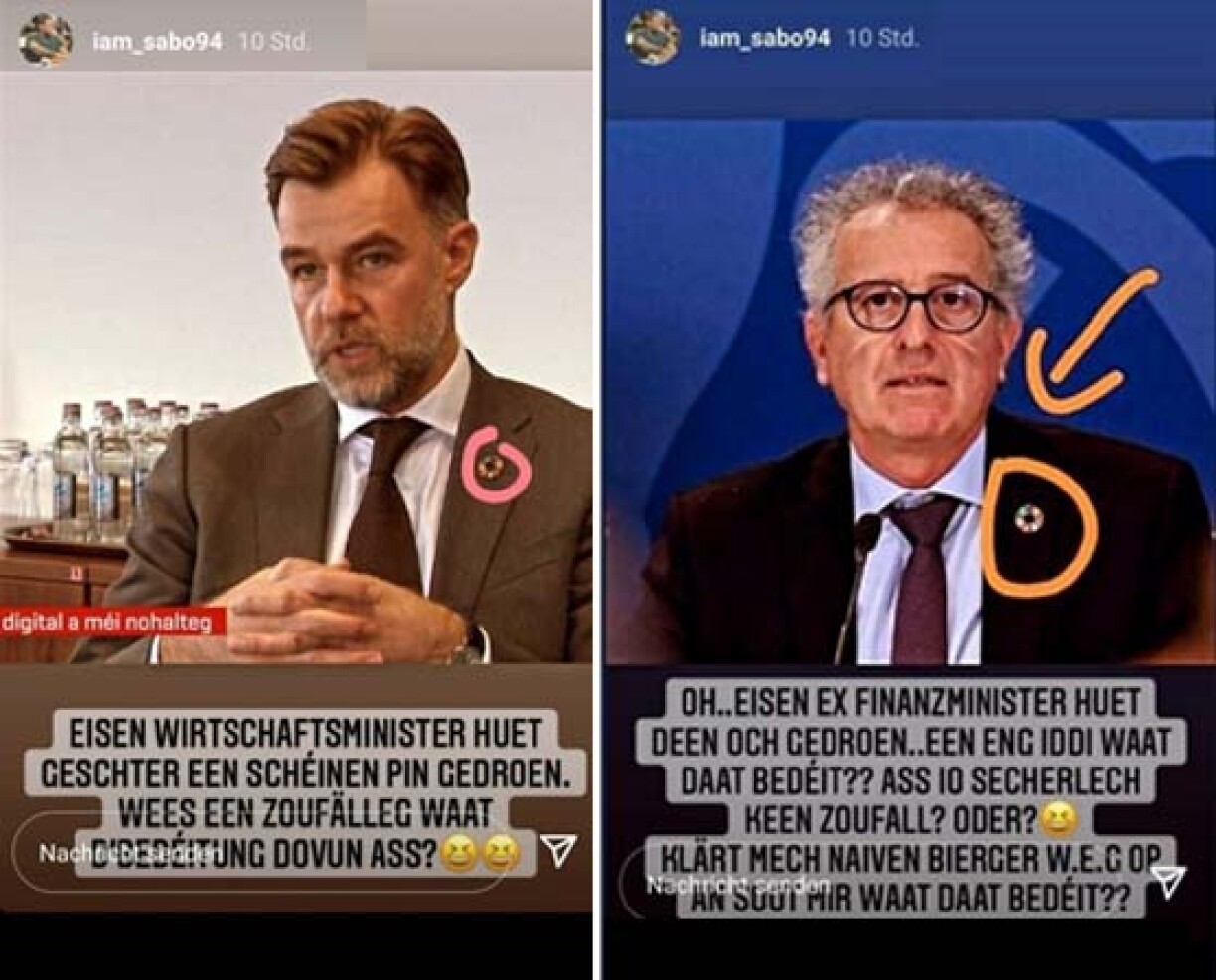 Den Ausgangspunkt vun dësem Check ass eng Instagram-Story, wou dräi Fotoe gepost goufe vun enger Persoun mam Pseudonym “iam_sabo94". Zwou Fotoen, wou op der enger de fréiere Finanzminister Pierre Gramegna an op där anerer den aktuelle Wirtschaftsminister a Minister fir Entwécklungszesummenaarbecht an humanitär Ugeleeënheete Franz Fayot ze gesi sinn. Alle béid hu se e Pin ugespéngelt, also eng dekorativ Broch. Zwee Mol déi selwecht!