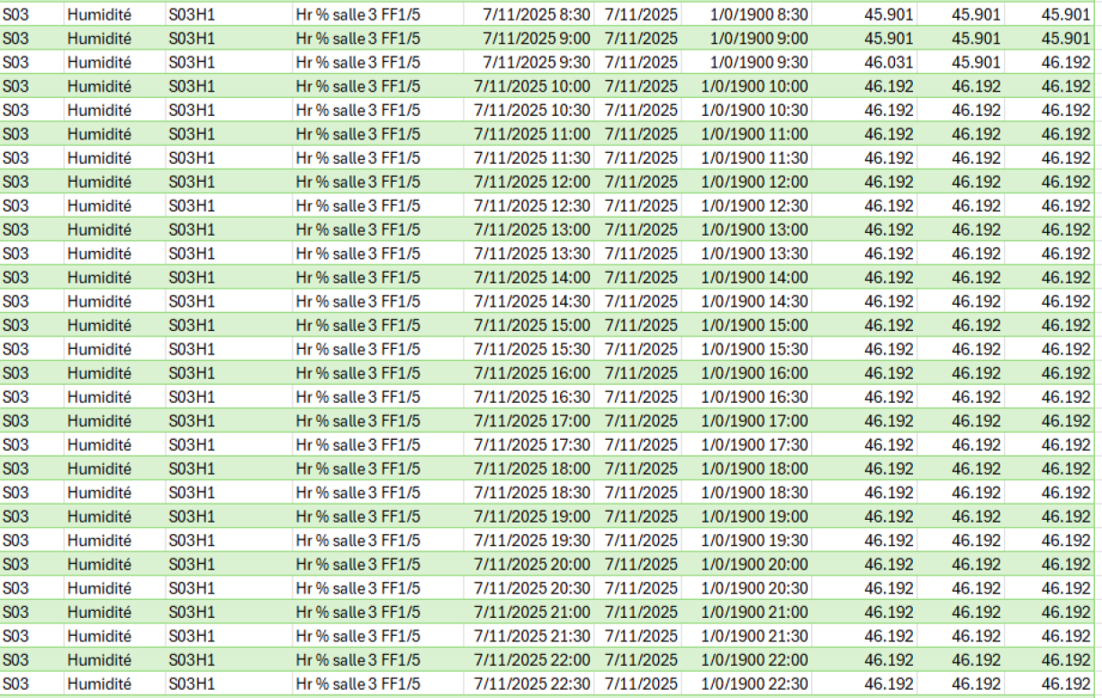 Ma d'Exploitatioun vun den Donnéeë weist och, datt et Probleemer mat de Miessunge gouf. Heiansdo weisen d'Capteure wärend Stonnen exakt déi nämmlecht Valeuren un, wéi zum Beispill am Sall 3, wou de Sensor vu Moies 10 Auer un hänke bliwwen ass (Illustratioun 5). En Indice, datt eppes net stëmmt an datt dee Moment keng Kontroll vun de Bedingungen do war.