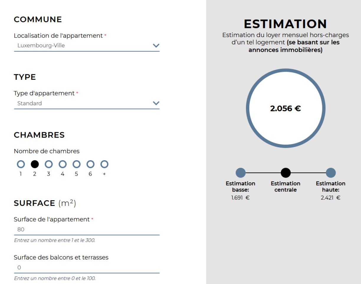 Am Beispill gi mir vun enger Wunneng aus, déi an der Stad ass. D’Appartement huet zwou Kummeren, 80 Meter Carré, eng Parkplaz an eng Koppel vun 30 Joer ouni Kanner wäert hei wunnen. Den Duerchschnëttspräis kann een op dësem Site schätze loossen. Deemno géif de Loyer fir en Appartement mat dëse Charakteristiken an der Stad ronn 2.056 Euro ouni Chargë kaschten.