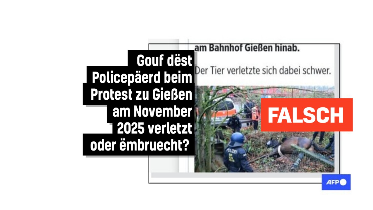 “Policepäerd schwéier blesséiert”, huet d’däitsch Dageszeitung “Bild” den 29. November 2025 um 11.44 Auer am Liveticker iwwer d’Grënnungsversammlung vun der Jugendorganisatioun vun der däitscher Oppositiounspartei “Alternative für Deutschland” (AfD) zu Gießen an iwwer d’Géigeprotester, déi de Kongress begleet hunn. “Bei de Protester ass géint 11.15 Auer e Päerd vun der Bundespolizei en Hiwwel bei der Gare vu Gießen erofgefall.” D’Boulevardzeitung huet zu dësem Text e Bild vun engem Policepäerd verëffentlecht, dat um Buedem läit, en Houf ass an engem ëmgeknéckte Maschendrot verheddert.