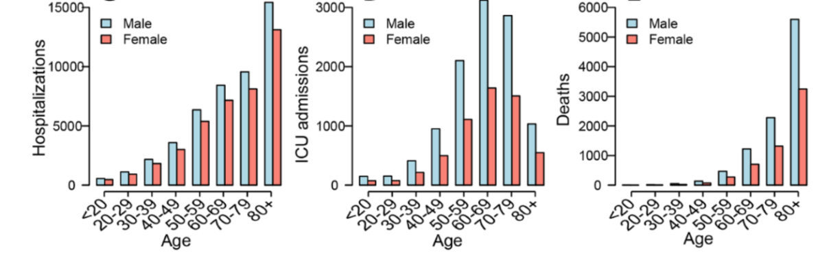 Bei der Mortalitéit gëtt et, jee no Alter, ganz grouss Ënnerscheeder. Persounen ënner 20 Joer hunn e Risiko vu 0,001 Prozent duerch eng Infektioun mam Virus ze stierwen. Bei Mënschen iwwer 80 Joer läit den Taux bei 10,1 Prozent. Ronn 60 Prozent vun den Doudesaffer ware Männer.