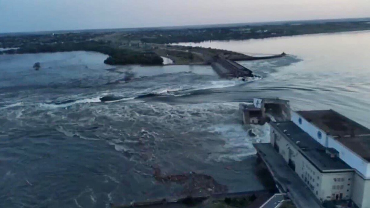 No der deelweiser Zerstéierung, d’Russe schwätze vun enger kompletter Zerstéierung vum Kachowka-Staudamm am Süde vun der Ukrain stinn Uertschaften an der Regioun Cherson ënner Waasser a Bewunner hu missen evakuéiert ginn. Déi ukrainesch Autoritéiten hunn ugefaange ronn 17.000 Mënschen a Sécherheet ze bréngen. Op der vu Russland occupéierter Säit vum Floss Dnipro solle weider 25.000 Mënschen evakuéiert ginn. Et gëtt geschat, datt Gebidder mat méi wéi 40.000 Awunner riskéieren, iwwerschwemmt ze ginn.