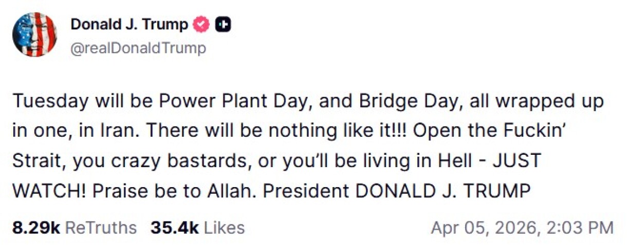 Virun deem Hannergrond huet den Donald Trump dem Iran an de Soziale Medien mat verstäerkten Attacke gedreet. En Dënschdeg den Owend 20 Auer wieren déi iranesch Kraaftwierker a Brécke drun, sollt d’Strooss vun Hormus net direkt opgemaach ginn.