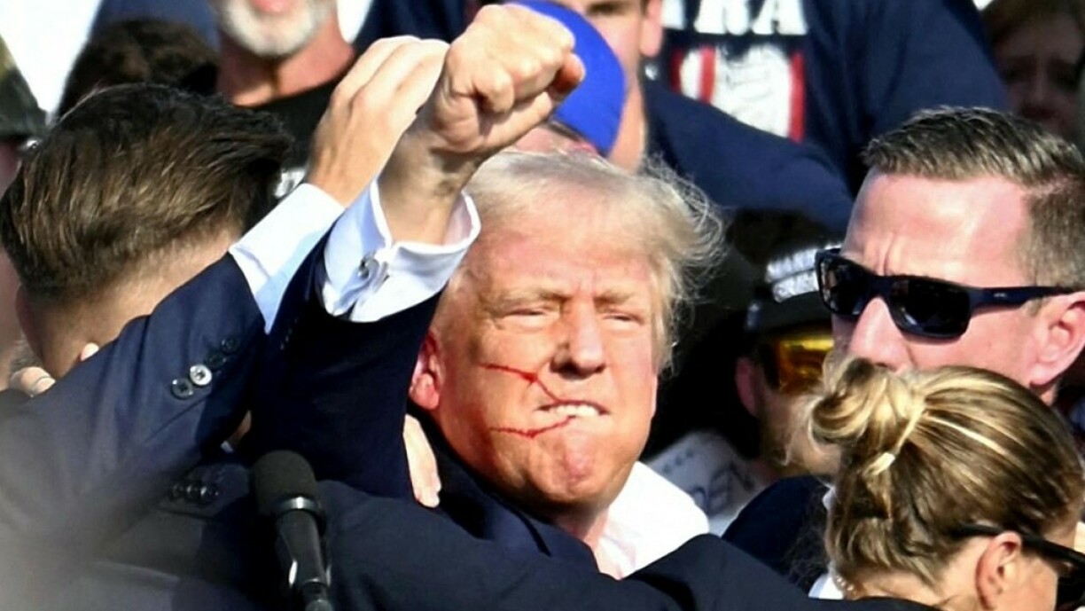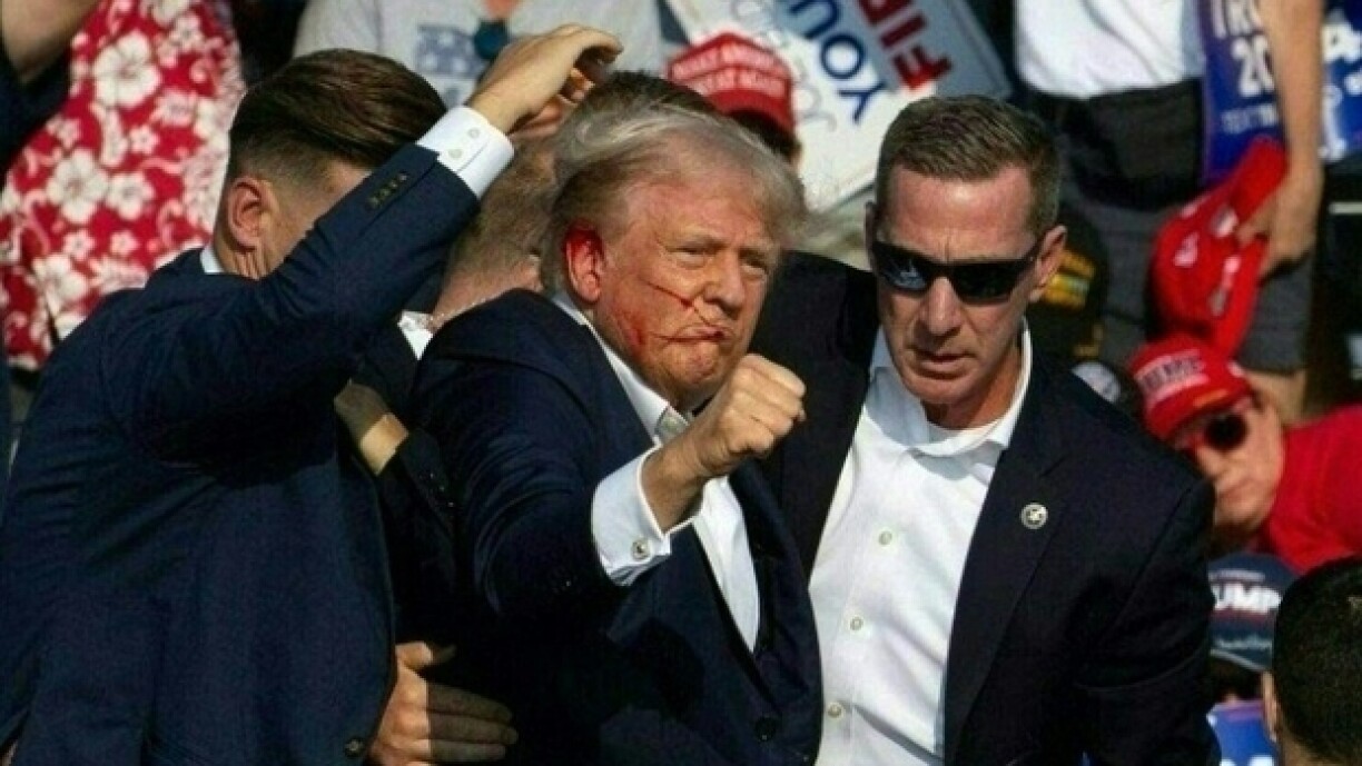 Direkt no de Schossgeräischer hate sech Sécherheetsleit vum Secret Service op den Donald Trump gestierzt an deen huet dunn – ëmzéngelt vu Beamten – d’Fauscht an d’Luucht gestreckt, wuel fir de Leit ze signaliséieren, datt et ëm den Ëmstänn entspriechend gutt geet.