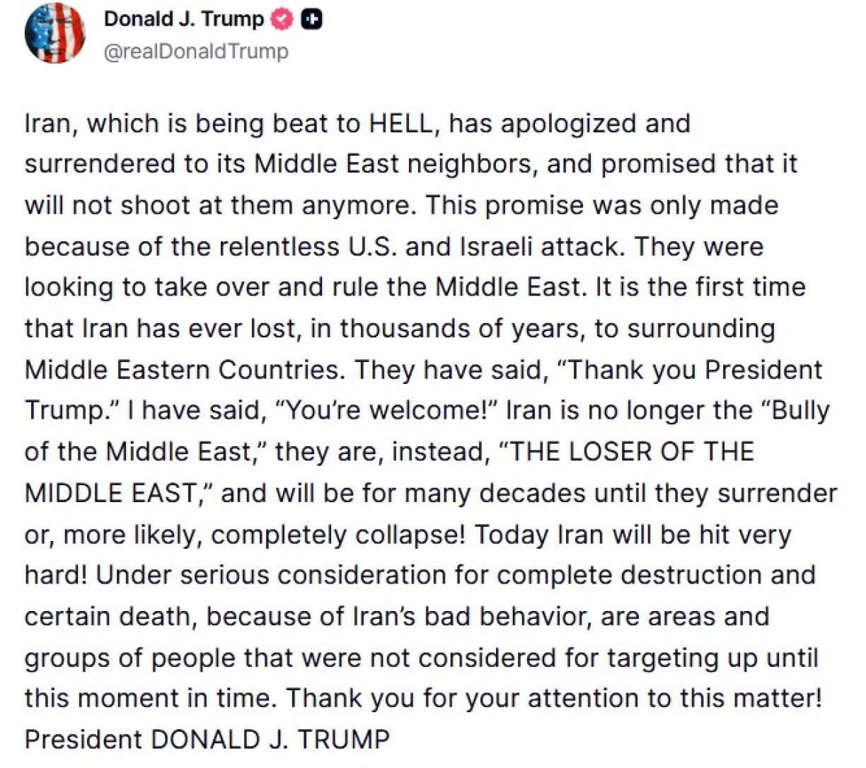 Den US-President Donald Trump hat eng Warnung op senger Plattform Truth Social gepost. Zum Schluss vu sengem Message huet den Trump geschriwwen, datt den Iran "haut ganz haart getraff gëtt". Hien huet dobäi vu kompletter Zerstéierung geschwat an dem sécheren Doud vun Ziler a Mënschegruppen, déi bis elo verschount bliwwe sinn.
