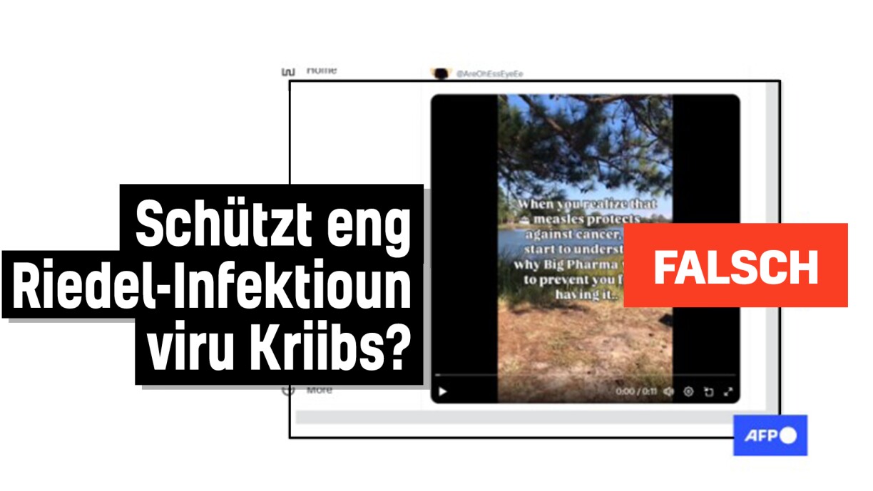 “Wann ee bedenkt, dass de Riedelvirus dofir bekannt ass, datt Kriibs net méi nogewise ka ginn ... a si déi lescht 50 Joer domat verbruecht hunn, Iech dovun ze iwwerzeegen,dass et eng vun den déidlechste Bedrounge fir d’Mënschheet ass”, sou den Text an engem Facebook-Video vum 13. Dezember 2025.