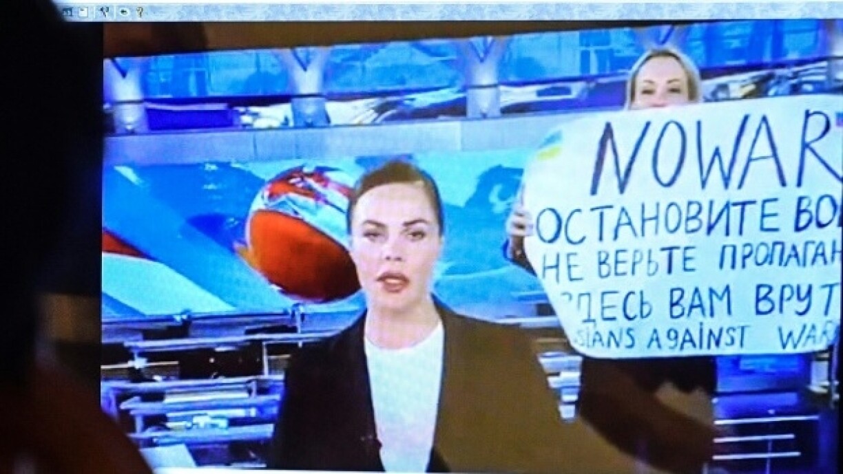 D’Marina Ovsyannikova ass wärend der Live-Noriichtesendung virun d’Kamera gelaf an huet eng Affiche gewisen, op där stoung “Stoppt de Krich”. An engem Video, deen d’Mataarbechterin vum Sender am Virfeld opgeholl hat, sot si, dat wat an der Ukrain géing geschéien, wier e Crime an dofir géing et just ee Responsabele ginn, de Vladimir Putin.