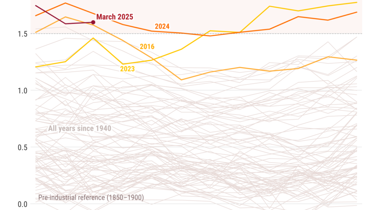 De Mäerz 2025 war mat enger globaler Duerchschnëttstemperatur vu 14.06°C deen zweetwäermste vun allen Zäiten. Dee vun 2024 war nach 0.08°C méi waarm, d’Moyenne vun 1991 bis 2020 läit 0.65°C ënnert dem neiste Wäert.