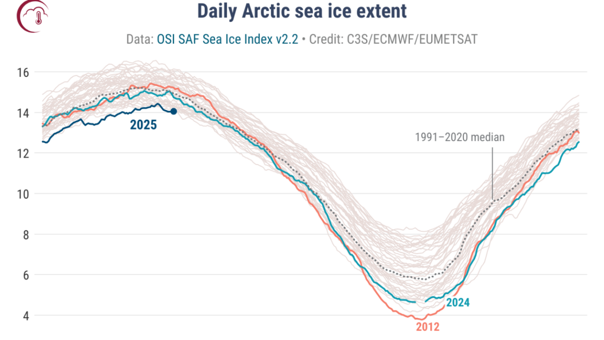 Sou wéineg Äis wéi ni virdru gouf dann am Mäerz 2025 ermëttelt. An de 47 Joer laangen Opzeechnunge via Satellit gouf et nach ni esou mann arktescht Äis: - 6% ënnert der Moyenne. Et ass de 4. Mount hannerteneen, dass bei deem Wäert e neie Minusrekord erreecht gëtt. An der Antarktis gesäit et net besser aus. Just dräimol war do nach manner Äis gemooss gi wéi dës Kéier.