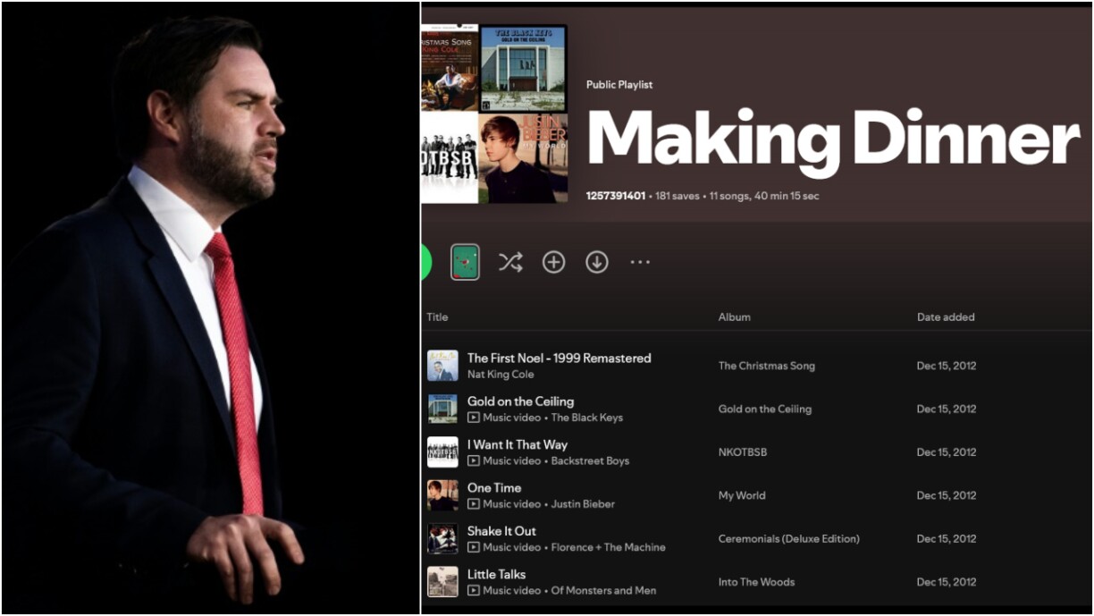Bëssen “I want it that way” vun de Backstreet Boys, dann och mol “One Time” vum Justin Bieber an zum Schluss nach “Satellite of Love” vum Lou Reed. Esou gesäit anscheinend d’Playlist “Making Dinner”, also “Owesiesse maachen”, vum US-Vizepresident J.D. Vance aus.