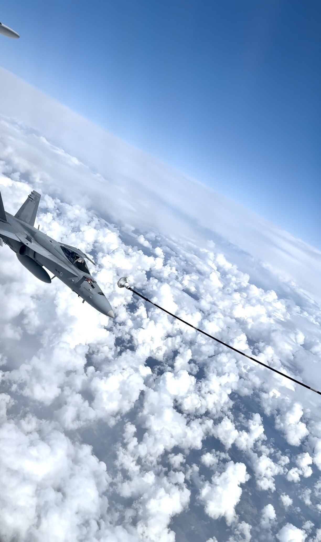 Schonn um 6 Auer ass et dofir zu Eindhoven an dem A330 op der Militärbasis lassgaangen a Richtung Litauen, dat iwwert d’Loftraim vun Däitschland a Polen. Zeréck goung et iwwer Lettland, Estland, Schweden, Dänemark, Norwegen a Groussbritannien. Ëmmer nees tauche Kampfjets vun de verschiddene Loftraim nieft de Fënsteren op, a kommunizéiere mat de Piloten. E schwieregt Manöver, erkläert een eis, well e Mindest-Ofstand tëscht den dräi Fliger gëtt et net, dat ass Ermiessens- a Konzentratiouns-Saach.