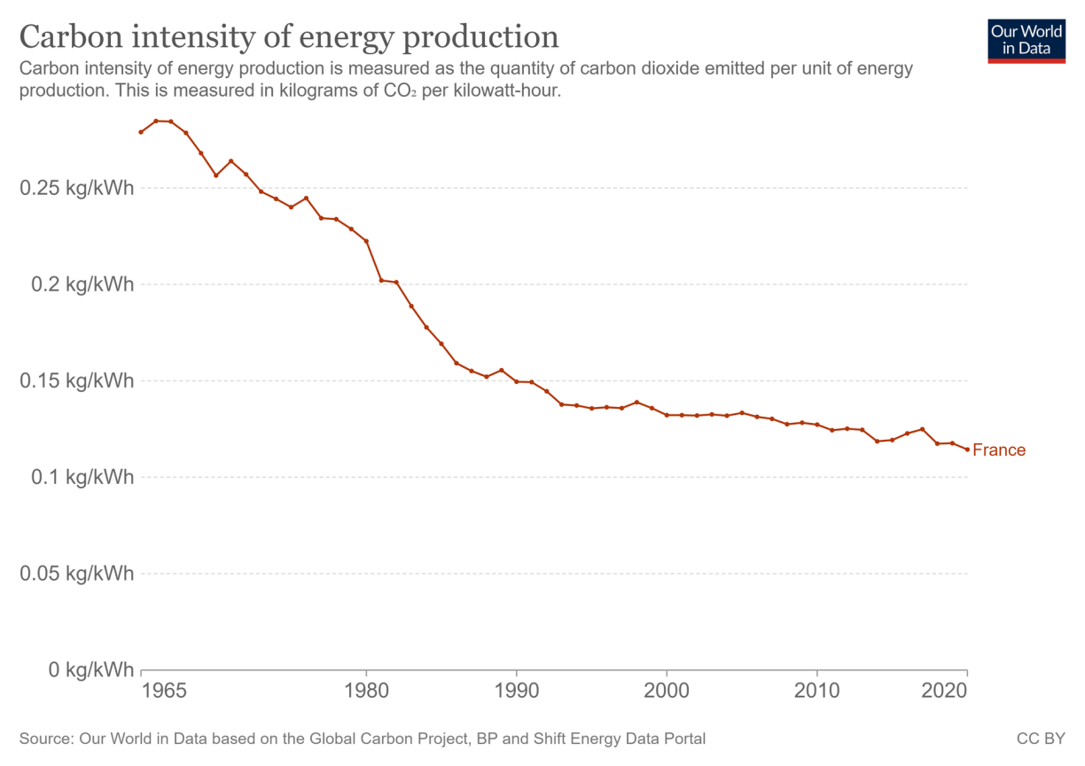 Ee Land, dat eng Reduzéierung vun den CO2 Emissiounen vun der Primärenergie an där Gréisstenuerdnung an engem vergläichbaren Zäitraum fäerdeg bruecht huet, ass Frankräich an de 70er an 80er Joren, also virun dem Zäitraum 1990 - 2005.