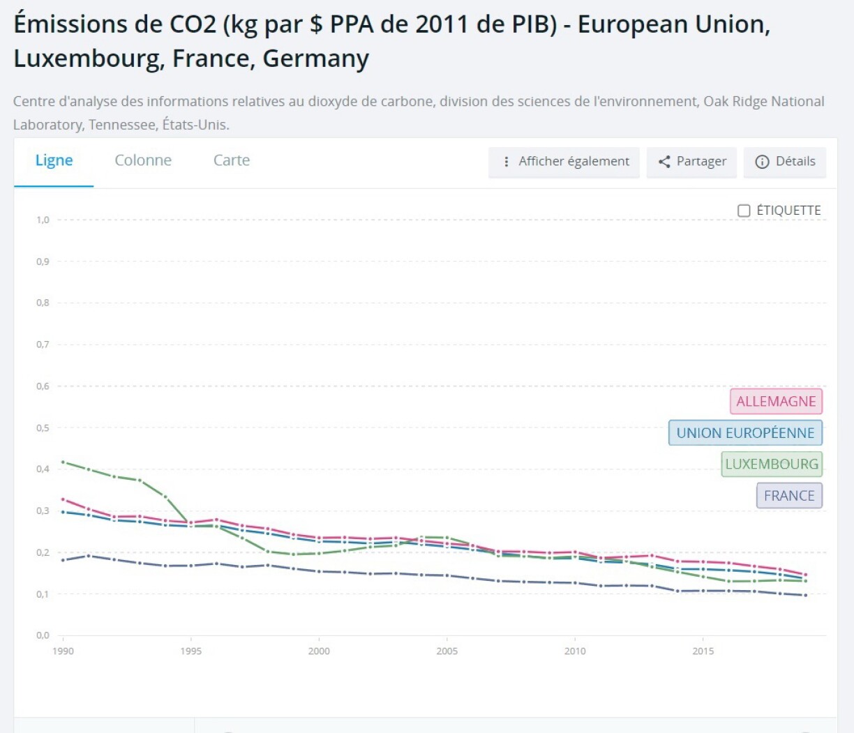Wat een och gesäit — an dat ass elo wichteg : déi virdrun ernimmten duerchschnëttlech järlech Reduzéierung ëm e puer Prozent vun der CO2 Intensitéit vun der Wirtschaft huet een tëschent de 90er Joren an 2019 vun der Gréisstenuerdnung hier net nëmmen zu Lëtzebuerg verzeechent, mä och am Frankräich oder an Däitschland, an och global strikt linear fir déi gesamt europäesch Unioun. Hei huet een e relativ konstanten Effizienz-Effekt.