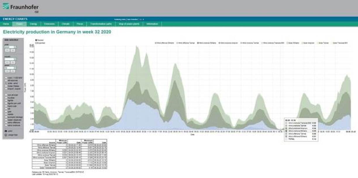 Alle Rekordmeldungen zum Trotz leien eenzel Maximalwäerter an där Woch bei ronn 7 bis 15 Gigawatt, also largement ënner der Verbrauchslaascht, an de Minimalwäert läit bei 0,14 Gigawatt, also quasi Null.