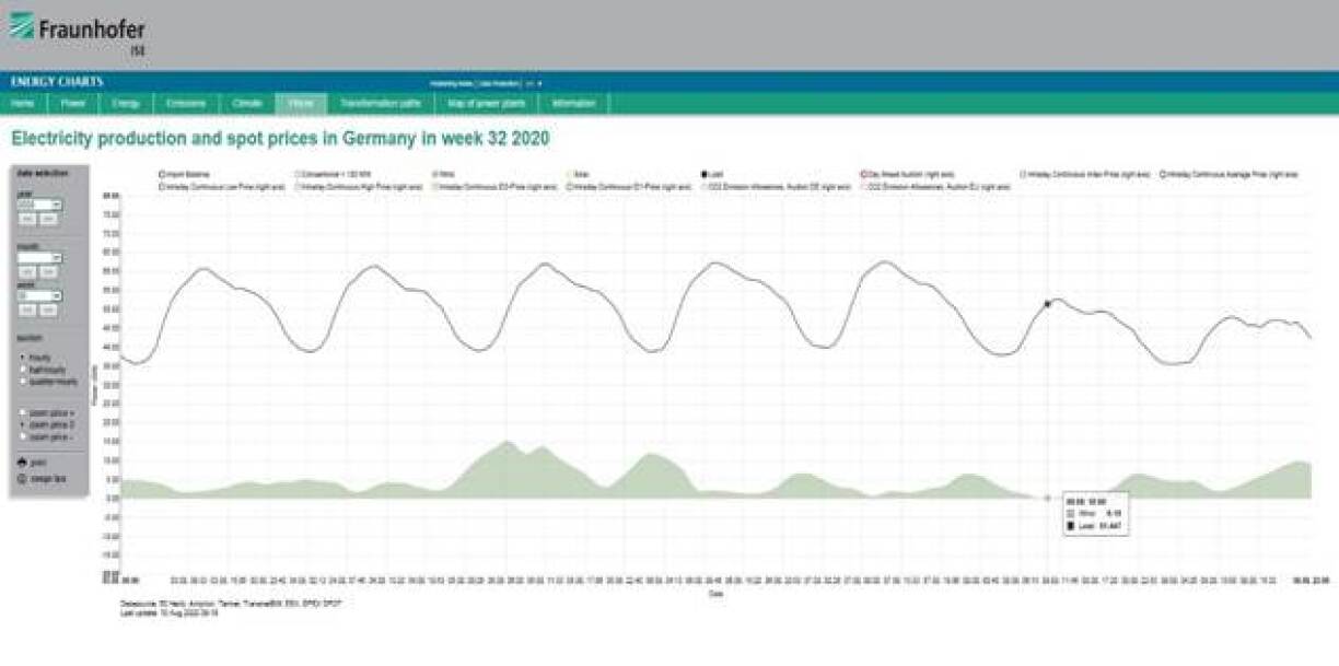 Wat awer elo nach vill méi interessant ass : an dëser Lockdown Situatioun koum et zu enger ongewollter Simulatioun vun deem wat geschitt, wann den Ausbau vu wiederofhängege Stroumquellen nach weidergedriwwe gëtt. Dat kann ee ganz flott mat den Opzeechnungen vum Fraunhofer Institut quasi a real time beobachten (cf. Grafiken hei drënner vun energy-charts.de).