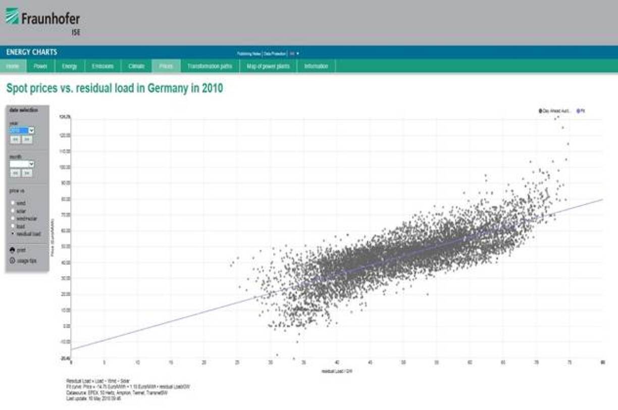 D’Residuallaascht aus reegelbare Kraaftwierker variéiert am Joer 2010 tëschent Minimalwäerter vu ronn 24 Gigawatt wou Wand- a Solarstroum also am meeschte geliwwert hunn, bis zu Maximalwäerter vu ronn 75 Gigawatt wou d’volatil Stroumproduktioun also quasi gläichzäiteg am ganze Land komplett ausgefall ass.