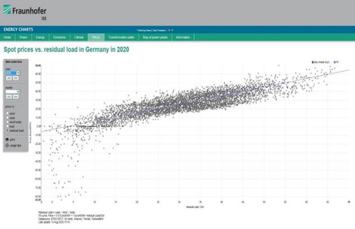 Op der Grafik hei drënner gesäit een fir d’éischt emol d’Situatioun vu virun 10 Joer fir e Verglach ze hunn. Den Undeel vu Wand- a Solarenergie louch deemools op engem vergläichsweis nidderege Niveau vu ronn 9% am Stroumsecteur. D’Grafik weist eng Punktwollek. All Punkt stellt eng vun den 8.760 Stonnen am Joer duer, a gëtt eis fir déi betreffend Stonn de Wäert vun der Residuallaascht (horizontal Skala) an zousätzlech de kuerzfristege Stroumpräis an där Stonn (vertikal Skala).