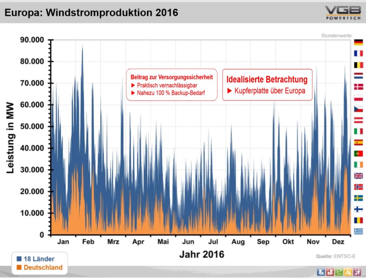 D’Grafik hei drënner weist ganz konkret d’Leeschtungsverdeelung vun allen europäesche Wandanlagen zesummegeholl beispillhaft fir d’Joer 2016. Déi erhofften geographesch Ausgläichseffekter bleiwe noweislech aus, esouguer ënner der idealiséierter Hypothees vun engem perfekt ausgebauten a verloschtfräiem europäesche „Supergrid“. Déi quasi SIMULTAN Schwankunge vun allen Anlage weisen, ewéi geféierlech all weideren Ausbau vun der Wandenergie fir d’Netzstabilitéit ass.