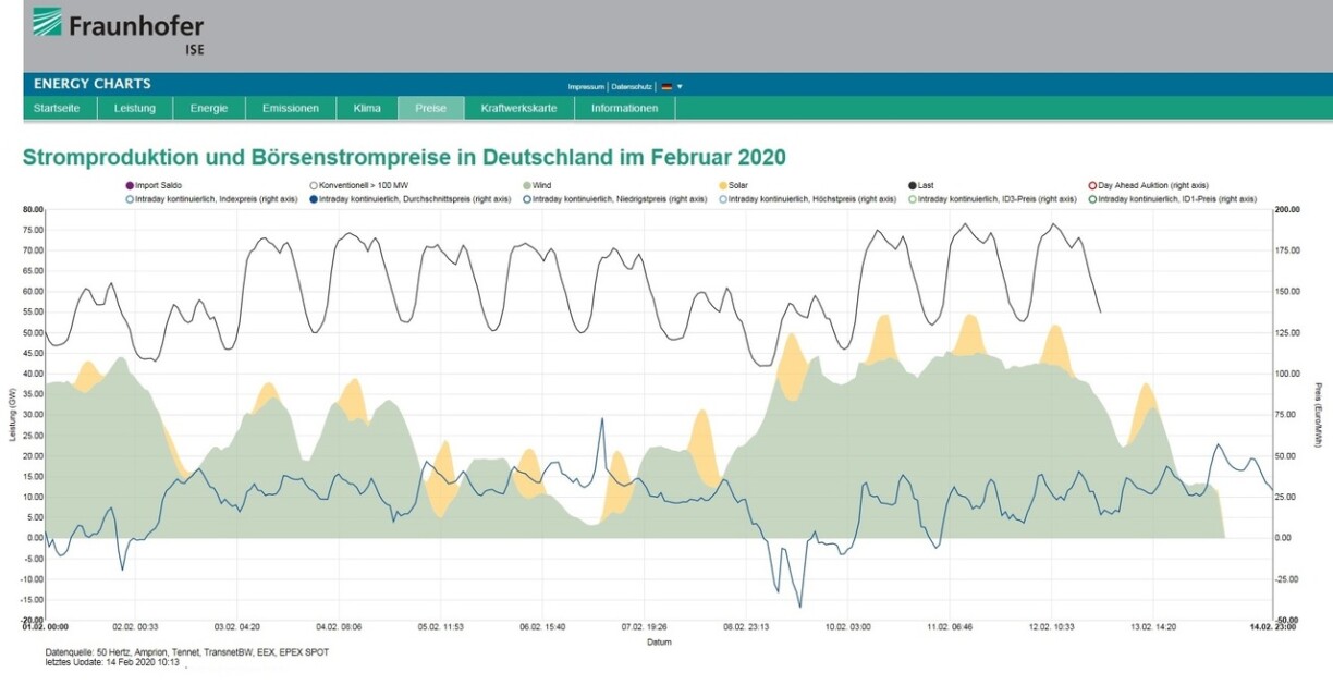 D’Grafik weist, dat dee Sonndeg Mëtteg mat héije volatile Leeschtungsspëtzten de kuerzfristege Stroumpräis bis op MINUS 42 Euro pro Megawattstonn gefall ass. Dat heescht dat een 42 Euro dofir BEZUELT huet, fir dat e Keefer engem de Stroum ofhëlt. Dorënner leide natierlech och déi konventionell Kraaftwierker déi hir Produktioun an esou Momenter net komplett op Null kënnen zeréckfueren, well ëmmer e gewëssen Undeel vu konventioneller Leeschtung gebraucht gëtt fir d’Netzfrequenz stabil ze halen, a well d’Kraaftwierker net séier genuch prett wieren, fir nees héichgefuer ze ginn wann de Wand an d’Sonn méi spéit nees abrupt noloossen. Eng komplett Ofschaltung ass ëmmer och mat héije Käschte verbonnen.