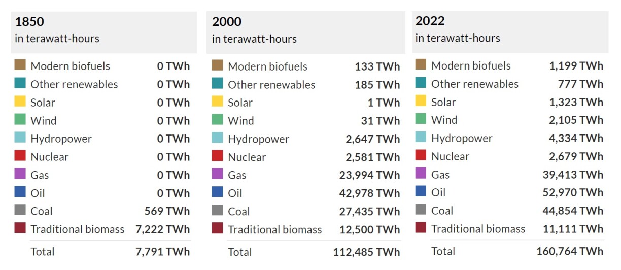 Bis haut gouf et an der Mënschheetsgeschicht nach ni eng global Energietransitioun : All „nei“ Energieform gouf just op déi vu virdrun dropgetesselt, ouni déi vu virdrun ze ersetzen.