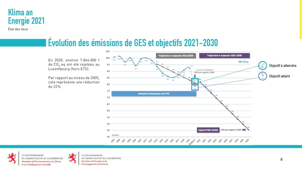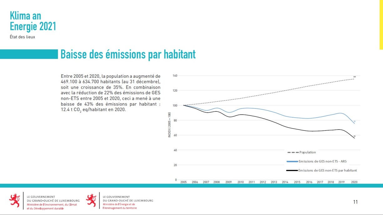 Et gëtt festgestallt, datt d’Klimazil fir d’Joer 2020 méi ewéi erreecht gouf. Et gëtt zwar kuerz erwäänt, datt d’sanitär Situatioun hei matgespillt huet, mä dës Nuance fënnt kee Nidderschlag an de gewisene Grafiken, an am Raum bleift d’Zuel vun enger Reduktioun vu -22% par rapport zum Joer 2005 stoen.