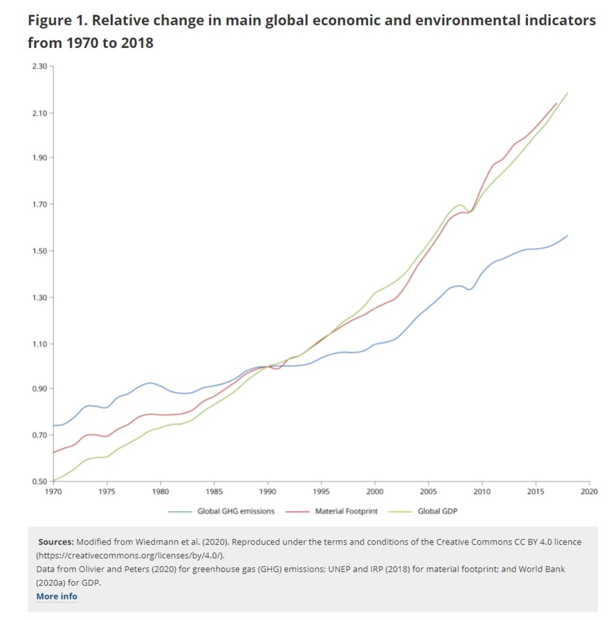 „Globally, growth has not been decoupled from resource consumption and environmental pressures and is not likely to become so (Parrique et al., 2019; Hickel and Kallis, 2020; Wiedmann et al., 2020). The global material footprint, gross domestic product (GDP) and greenhouse gases emissions have increased rapidly over time, and strongly correlate (Figure 1).“