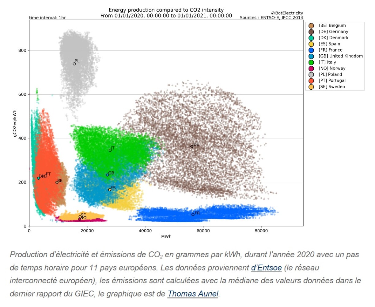 Länner déi bei 50 gCO2/KWh an drënner leien (Norwegen, Schweden a Frankräich), baséieren hire Stroumsystem haaptsächlech op d‘Waasserkraaft (déi awer nëmme begrenzt verfügbar ass) an op d‘versuergungssécher Nuklearenergie.