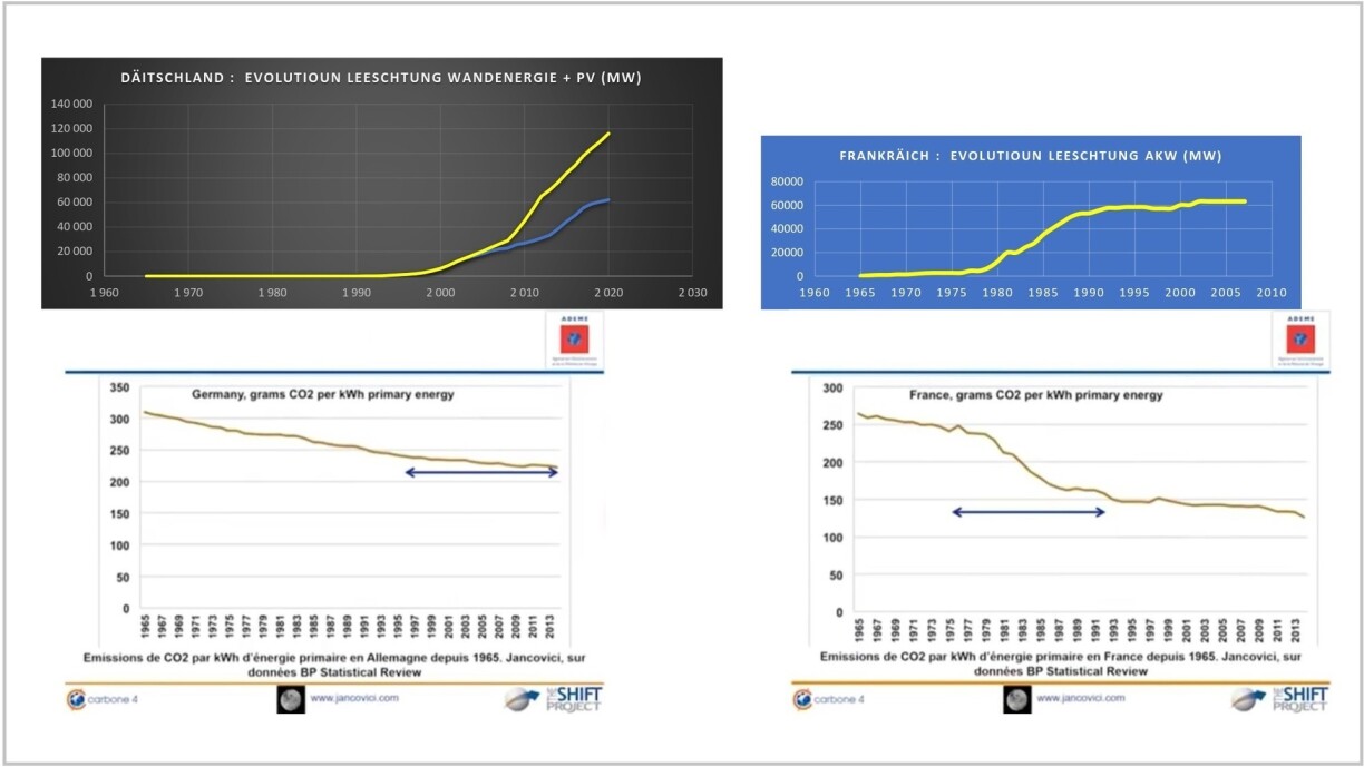 Am direkte Vergläich tëschent Däitschland a Frankräich gesäit ee wéi een Energiemodell an der Praxis tatsächlech eng Wierkung bei der Dekarboniséierung vun der Primärenergie weist :