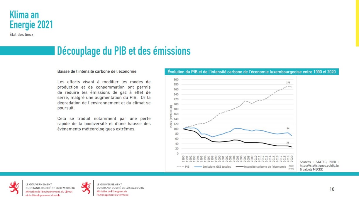 Déi zwee lescht genannten Indicateuren stellen zesummen d‘Kuelestoffintensitéit vun der Wirtschaft duer, déi een och an der Grafik vun den zwee Ministere gesäit, an déi no den Zuele vun EUROSTAT säit dem Joer 2005 eng relativ linear järlech Reduzéierung vun duerchschnëttlech ronn 4% fir Lëtzebuerg weist. Esouwuel de Modell ewéi och d’Realitéit confirméieren awer, datt dës Reduzéierung am Gesamtresultat nees zu engem groussen Deel duerch eise Wuesstem kompenséiert gouf, dofir leien eis järlech Reduktiounen jo just am Promillberäich. Et gëtt also guer keng Entkoppelung vu Wuesstem an Zäregasemissiounen.