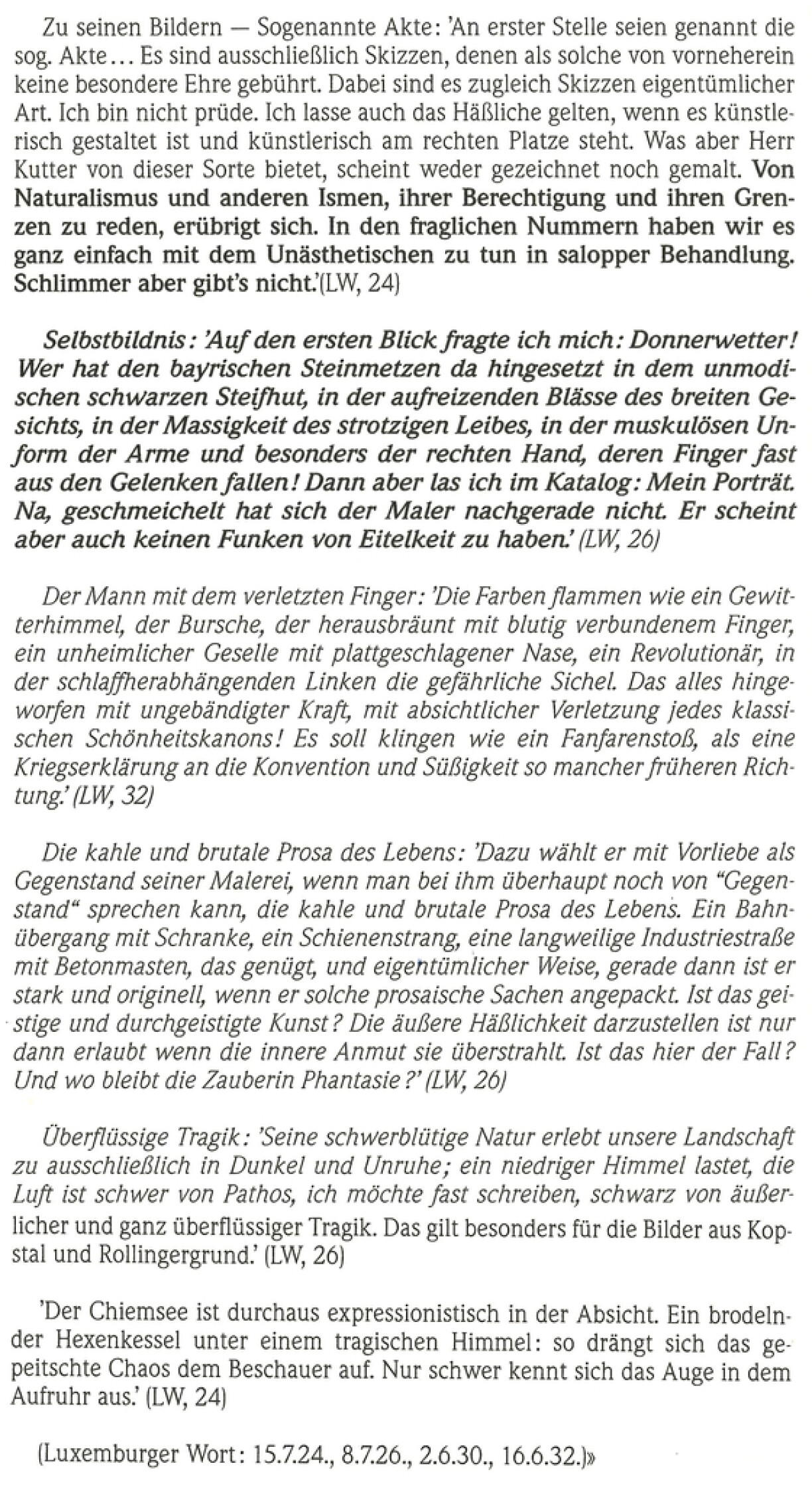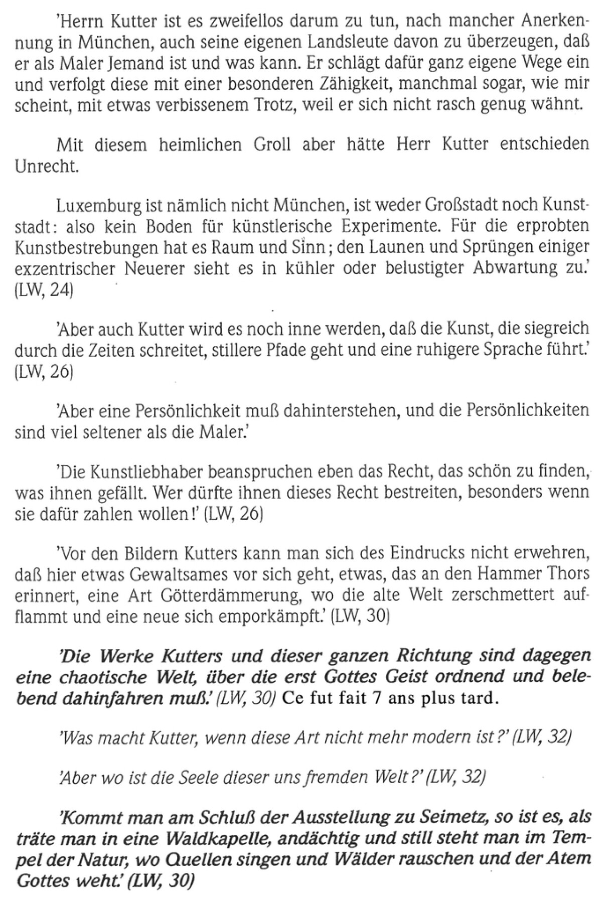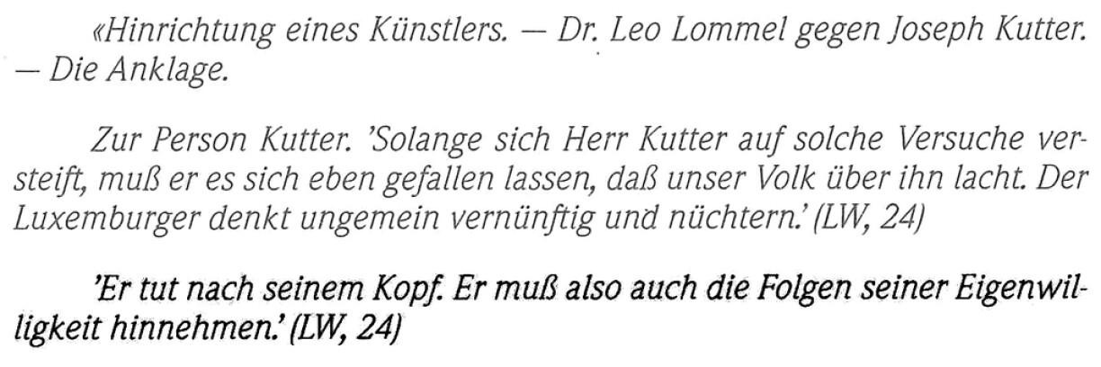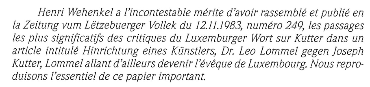 Joseph Kutter, le plus grand des sécessionnistes, a dû subir entre 1924 et 1932, soit pendant huit longues années, une campagne sans merci, d’une parfaite idiotie et d’une hargne monstrueuse de la part de Lommel, Evêque de Luxembourg et directeur du Wort. C’est la sombre époque où l’expressionnisme, comme catégorie de peinture, était tombé dans le collimateur nazi où il fut traité d’Entartete Kunst.