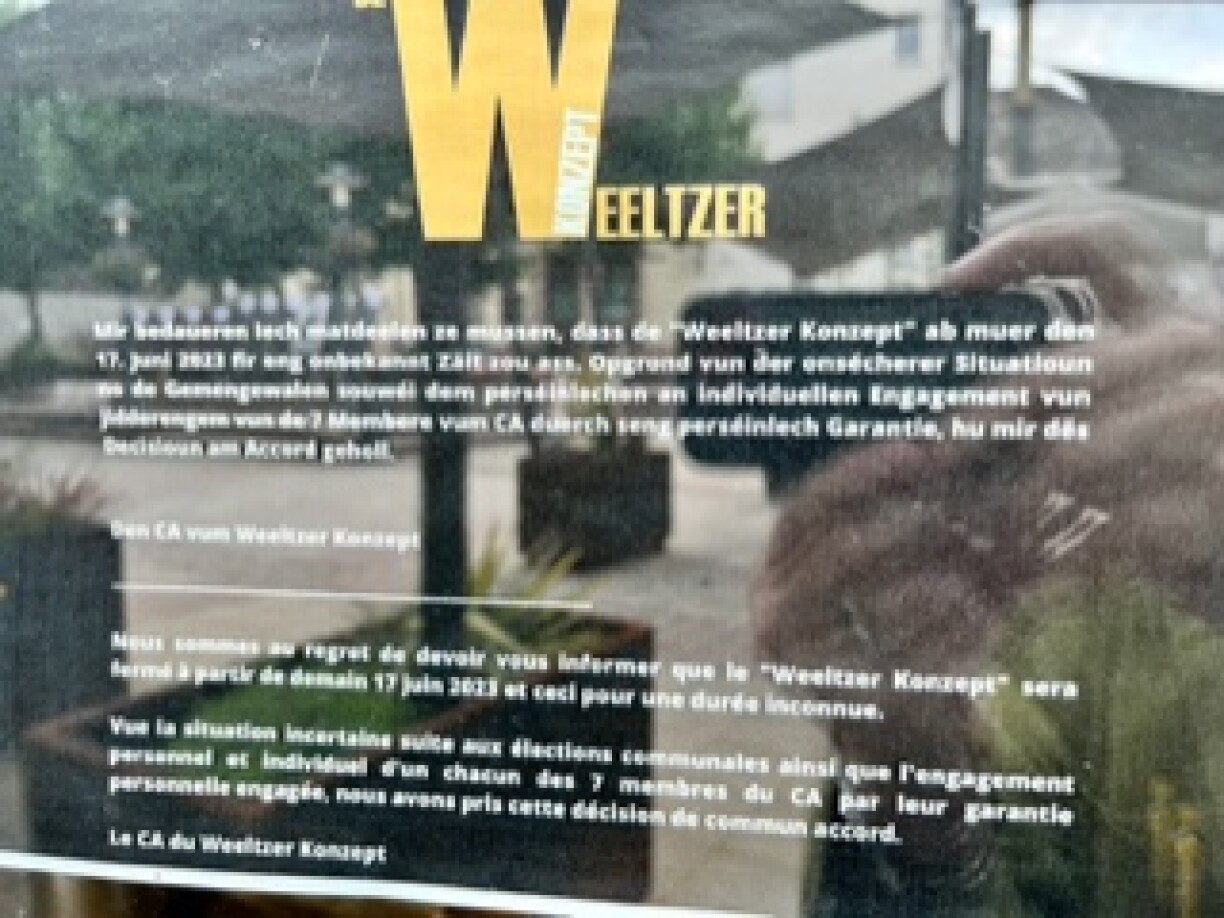 “Mir bedaueren Iech matdeelen ze mussen, dass de „Weeltzer Konzept“ ab muer den 17. Juni 2023 fir eng onbekannt Zäit zou ass. Opgrond vun der onsécherer Situatioun no de Gemengewahlen souwéi dem perséinlechen an indviduellen Engagement vun jidderengem vun de 7 Memberen vum CA duerch seng perséinlech Garantie, hu mir dës Decisioun am Accord geholl.